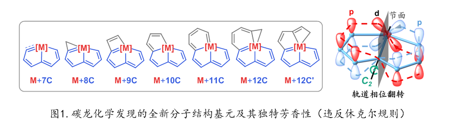 关于芳香性,Craig曾理论预测(Nature 1958, 181, 1052)若d轨道参与π共轭,轨道相位将翻转并出现反休克尔芳香性,其分子骨架仍可保持平面性。但该理论一直未被实验证实。夏组2013年报道的M+7C(图1)正是实验上成功捕获的Craig模型物种,从而证实了Craig半个多世纪前的理论预测。随后,夏组发现了一系列稳定的由碳链螯合过渡金属的Craig物种或聚合物。建立了富有特色的“碳龙化学(Carbolong Chemistry)”。“long”取自于“龙”的汉语拼音,“Carbolong”也可以解读为“长碳链”。碳龙配合物和聚碳龙因金属直接嵌在全共轭稠环骨架的桥头位置,金属的d轨道参与共轭,其性能与传统有机、高分子共轭体系很不一样。具有宽、强的吸收光谱,吸光后,除了有光、电、热三个能量出口外,有时还会发出超声波。在太阳能利用、小分子活化、催化、锂-氧电池、高分子材料修复、生物医学等领域具有良好的应用前景。