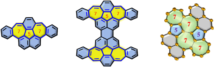 相较于传统的苯环类化合物,具有非交替拓扑结构(非六元环)的石墨烯分子(NGs)展现出独特的结构、光学和电子特征[1-9]。近年,把非交替拓扑结构作为缺陷单元(如Stone-Wales缺陷)引入到石墨烯中,在拓扑绝缘体、石墨烯量子点和量子比特等方面引起了研究人员的广泛关注。在本报告中,我们将介绍具有非交替拓扑结构的石墨烯分子自下而上的精准合成(图一),例如七-五-七元环和四个连续七元环的构建等。为了认识和理解非交替拓扑结构对其电子和光学特性的影响,我们采用了不同的表征手段,包括循环伏安法、拉曼、稳态/瞬态吸收和理论计算等。与只含有六元环的石墨烯分子相比,含有非交替拓扑结构的分子具有明显的反芳烃特性和更窄的能隙。同时,我们也尝试开发新的合成方法来制备杂原子掺杂的非六元环的石墨烯分子,包括氮掺杂的五-七元环和五-八元环等。我们的工作为精确合成具有非交替拓扑结构的石墨烯分子开辟了一条新的途径,同时对于调控石墨烯分子的化学和光电性质以及他们在光电器件中的应用也具有重要的指导意义。