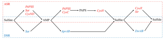 ASR和DSR途径研究是基于处理纺织废水的生物膜- MBR中获取的生物膜垢的宏基因组数据集。与亚硫酸盐产生相关的硫酸盐还原被观察到与生物污染物同步形成。然而,与进水相比,MBR出水中的硫化物浓度并没有发生变化,这说明硫酸盐转化为硫化物的条件并不理想。我们在生物膜垢中发现包括Desulfovibrio、Desulfainum、Desulfobacca、Desulfobulbus、Desulfococcus、Desulfoema、Desulfosarcina、Desulfobacter、Desulfobacula、Desulfofaba、Desulfotigum、Desulfatibacillum、Desulfatitalea、Desulfobacterium在内的多种SRB,并且在具有相当生理多样性的生物膜垢微生物群落中存在大量SRB。ASR似乎是一个必要的硫酸盐还原途径,因为在生物膜垢中有很高比例的细菌携带同化硫酸盐还原酶。与携带ASR的细菌相比,在更多的细菌中发现了完整的DSR通路。结合大量催化“AMP→亚硫酸盐”的细菌,发现MBR出水中有硫铝酸盐积累。我们希望进一步的研究可以集中在控制ASR或DSR途径的表达,以控制废水中的硫酸盐、亚硫酸盐和硫化物浓度。