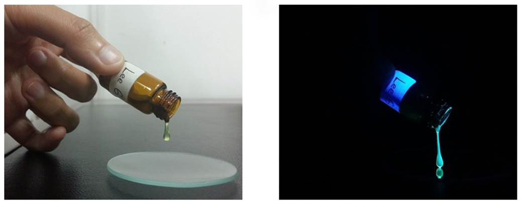 图1 分子1的化学结构及其在日光(下左)和在紫外光(下右)下的照片。