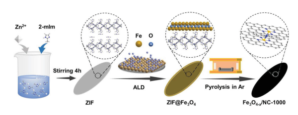鉴于此,深圳大学孙灵娜教授课题组联合加州大学陈少伟教授课题组,以Zn-ZIF为模板,使用等离子体增强原子层沉积技术在ZIF上沉积一层原子级厚度的Fe3O4,随后经过1000 ℃的可控热解处理,Fe3O4转化为具有丰富氧空位的 Fe3O4-x 团簇,并锚定在Zn-ZIF衍生的氮掺杂碳框架上。优化条件所制备的纳米复合物(Fe3O4-x/NC-1000)在碱性和酸性介质中均表现出优异的氧还原性能(碱性介质中半波电位可达0.930 V vs. RHE)、长循环性能和抗甲醇毒化作用。如此优异的ORR性能主要归因于:1、原子级厚度的Fe3O4沉积在二维Zn-ZIF上,使得后续处理所得的缺陷 Fe3O4-x在碳骨架上富集,活性位点得到了充分的暴露;2、氧空位对导电性、氧吸附能力以及电子转移动力学的提升;3、具有电荷再分布作用的氮掺杂石墨化碳,既可以作为质子和电子转移的良好媒介,又可以作为锚定 Fe3O4-x团簇的基体。鉴于Fe3O4-x/NC-1000具有优异的ORR性能,将其作为锌空气电池的空气阴极催化剂层,具有高达158 mW cm-2的能量密度,在5 mA cm-2电流密度下可以超过600小时稳定充放电循环2000圈。