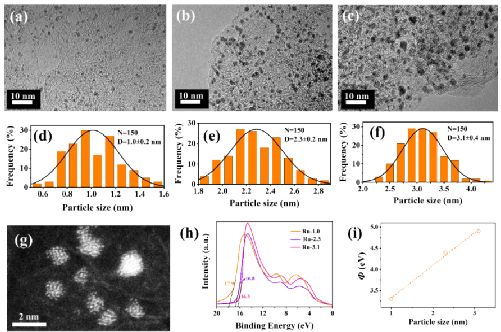 尺寸介于单原子与纳米颗粒之间的亚纳米团簇,通常由几个到几十个金属原子组成,由于其尺寸与电子的费米波长相当,亚纳米团簇的电子结构表现为不连续的能级。而且,量子尺寸效应导致团簇的电子结构以及催化性能与单原子和纳米颗粒截然不同。此外,与纳米颗粒相比,亚纳米团簇具有更大的表面/体积比以及更高的金属利用率。因此,我们认为具有独特电子结构的亚纳米Ru簇可能同时具有较强的水解离能力以及较高的金属利用率,从而实现低成本和高效的碱性HER。但是,亚纳米金属钌簇的碱性HER活性仍有待研究。因此,我们利用微孔的空间限域并结合可控焙烧,合成了一系列超小尺寸的钌纳米粒子:从单原子钌、亚纳米钌簇到钌纳米粒子。研究发现,钌粒子的d带中心随着粒径的减小几乎呈线性的关系向上移动,而亚纳米钌簇的d带中心最接近费米能级,表现出最强的水解离能力以及最高的碱性HER活性。得益于较高的金属利用率以及优异的水解离能力,在过电势为100 mV的条件下,亚纳米钌簇的TOF值高达43.3 s-1,是商业铂碳催化剂的36倍。