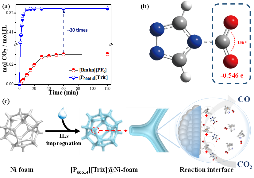 通过将超碱性和疏水性离子液体限制在Ni泡沫孔中,构建了一种具有自支撑结构的电催化剂。这些离子液体可以调节泡沫镍的表面,并在电极/电解质周围形成高浓度CO2的微环境,抑制泡沫镍的析氢反应。超碱性离子液体将线性CO2分子调节为弯曲的几何结构,降低其活化能垒,从而成功的将CO2电还原为CO产物。相关研究内容以“Superbase and Hydrophobic Ionic Liquid Confined within Ni Foams as a Free-Standing Catalyst for CO2 Electroreduction”为题发表于ACS Applied Materials & Interfaces(影响因子10.383,中科院1区)。我院冯建朋博士后为第一作者,我院教师杨恒攀研究员与何传新教授为通讯作者。