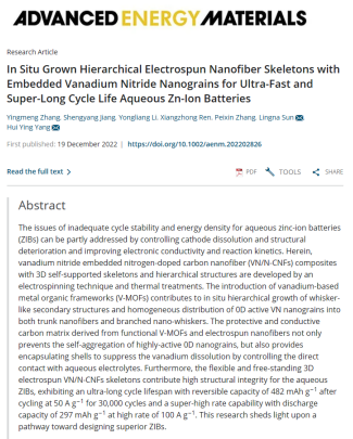 孙灵娜教授团队在期刊《Advanced Energy Materials》(影响因子29.7,中科院JCR 1区,TOP期刊)上发表了题为《In-Situ Grown Hierarchical Electrospun Nanofiber Skeletons with Embedded Vanadium Nitride Nanograins for Ultra-Fast and Super-Long Cycle Life Aqueous Zn-Ion Batteries》的研究论文,同时也是当期期刊的封面论文。该团队蒋圣阳硕士研究生和张颖朦副研究员为共同第一作者,孙灵娜教授和新加坡科技与设计大学杨会颖教授为共同通讯作者。深圳大学为第一作者单位和通讯单位。以下是论文的摘要和封面。