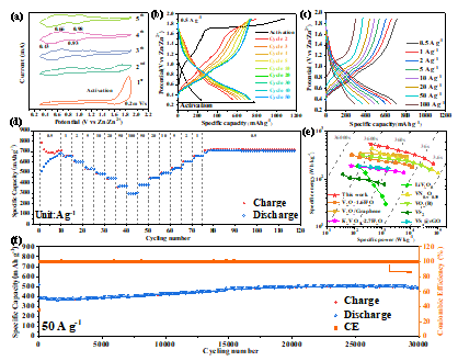 鉴于此,该团队将V-MOF的功能特征与静电纺丝技术相结合,制备了具有多级结构并内嵌VN纳米颗粒的3D自支撑N掺杂碳纳米纤维(VN/N-CNFs)复合材料。这种多级结构是通过两步热处理获得的,其从主干碳纳米纤维中生长出晶须状次级纳米结构。基于钒元素的金属-有机框架材料 (V-MOFs) 实现了活性VN纳米结构在静电纺丝纳米纤维碳框架中的原位均匀分布,这不仅可以防止0维活性纳米颗粒的自聚集,还提供了具有保护性和导电性的保护层,以避免活性材料与水电解质的直接接触。此外,这种树枝状的多级纳米结构可以有效地减轻电极材料的结构退化和体积变化。因此,这种设计策略有助于水性ZIBs的超长循环寿命和超高倍率性能。进一步结合原位电化学活化和转化过程,电极在0.5 A g-1下可获得高达734 mAh g-1的可逆容量。此外,VN/NCNFs正极在50 A g-1下循环30000次后表现出482 mAh g-1的稳定容量,甚至在100 A g-1的超高倍率下提供297 mAh g-1的放电容量。这项工作为具有高容量和高能量/功率密度的超大倍率和超长循环寿命水系ZIB的电极设计提供了依据。