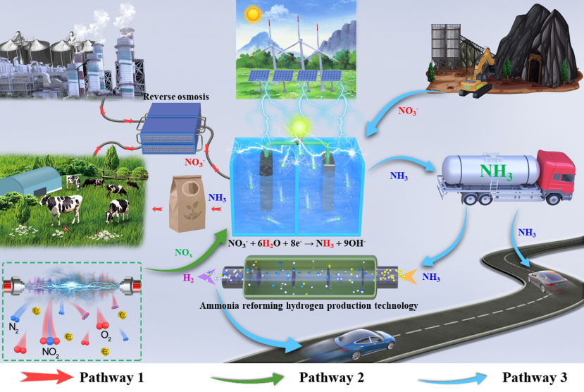 氨(NH3)化学肥料和现代化工产业中的核心原料,氨的生产对国民经济和综合国力影响重大。另一方面,氨本身也是一种非碳能量载体,可以作为储能载体和清洁燃料,符合“碳中和”和“碳达峰”的国家战略。除此之外,由于液氨的体积储氢密度比液氢高1.7倍,且氨气的自燃点达到651.1 ℃,其安全性远远优于氢气,因此,氨被认为是极具竞争力的“绿氢”储运载体。硝酸根还原反应(Nitrate reduction reaction,NO3-RR,NO3- + 6H2O + 8e- → NH3 + 9OH-)是实现“绿氨”制备的有效途径之一,探索高效催化剂是实现NO3-RR制氨工业化应用的关键。