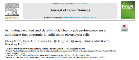 CO2还原反应基元步骤多(分子扩散、吸附、解离、电荷转移和CO脱附等)和能耗高,单相催化材料较难实现多步骤高效催化转化。范梁栋课题组针对性设计和合成了复合电极催化剂提升CO2的催化转化能力。题为《Achieving excellent and durable CO2 electrolysis performance on a dual-phase fuel electrode in solid oxide electrolysis cells》的研究性论文由深圳大学博士后李一航和2020级研究生李炎璞同学为共同一作、深圳大学范梁栋为通讯作者合著,深圳大学为第一作者单位和唯一通讯单位。该论文发表于国际期刊Journal of Power Sources(影响因子9.794,中科院大类1区)上。论文发表至今已被引16次。