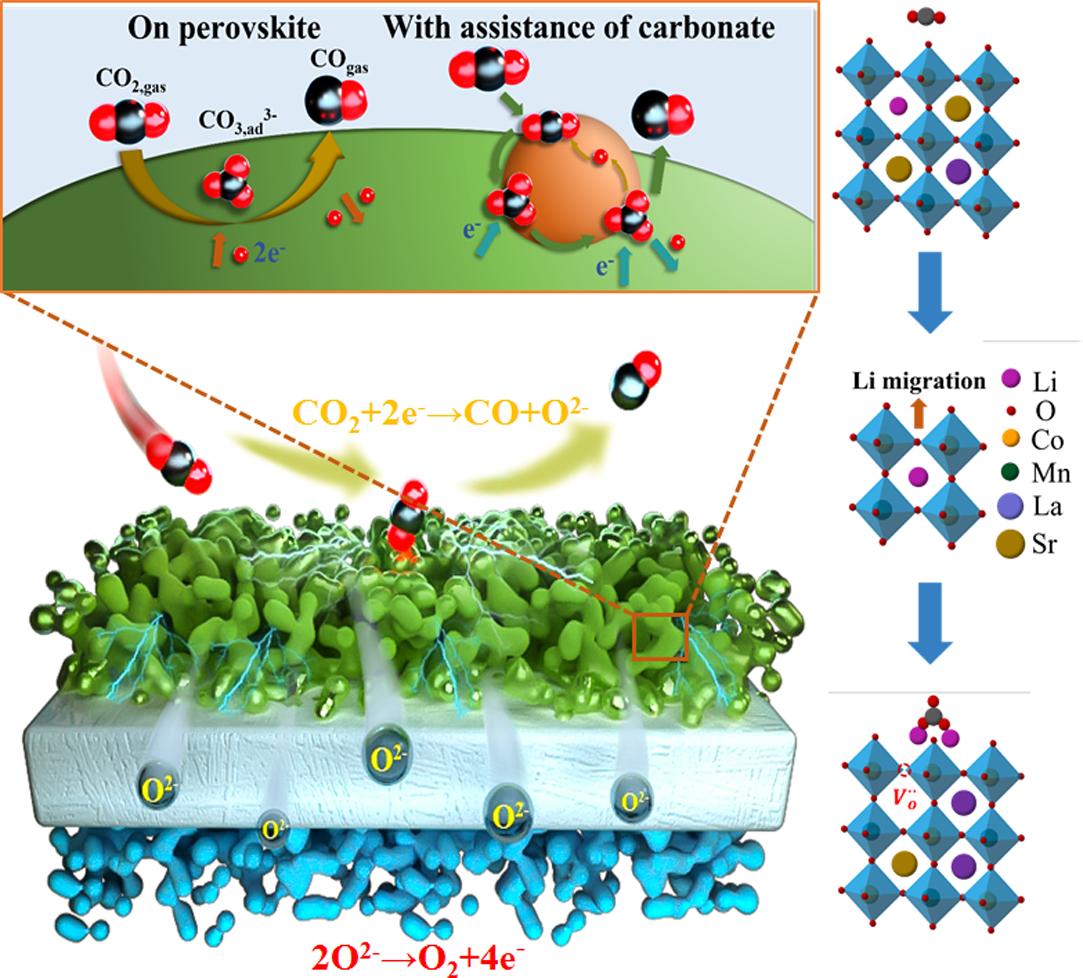 随着现代社会的快速发展,人类对于能源的需求日益增加,传统燃料的过度使用造成了大量温室气体二氧化碳(CO2)的排放,太阳能、风能等新能源又因为其不稳定性等问题限制着其有效利用。利用新能源的多余电量将CO2转化为其他可燃类气体,如一氧化碳或者碳氢燃料气体,是充分利用新能源和节能减排的有效方案。固态氧化物电解池(SOECs)由于其高效的转化效率和有利的热动力学条件,受到许多研究工作者的关注并将它们应用在CO2的电解中。题为《Enhancing Electrochemical CO2 Reduction on Perovskite Oxide for Solid Oxide Electrolysis Cells through In Situ A-Site Deficiencies and Surface Carbonate Deposition Induced by Lithium Cation Doping and Exsolution》的研究性论文由硕士研究生林万斌为第一作者,深圳大学范梁栋、台北科技大学Te-Wei Chiu与哈尔滨工业大学(深圳)潘泽华为共同通讯作者合著。深圳大学为第一作者单位和第一通讯单位。该论文近期发表于国际期刊Small(影响因子15.153,中科院大类 1区)上。