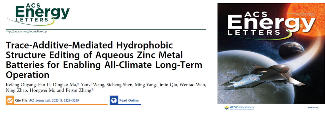 4. 为解决Zn2+传输动力学缓慢和电解质界面热力学不稳定等问题,提出了痕量添加剂介导的疏水结构编辑概念,通过向水系电解液中添加聚丙烯酸(PAA)来重建电解液Zn2+溶剂化结构并实现电极-电解液界面原位自组装。重构的Zn2+水合结构具有快速的电化学反应动力学,而电极表面界面层极大提高了水系锌金属电池体系的热力学稳定性,从而实现了宽温域的长期运行。该成果作为封面文章发表在《ACS Energy Letters 》(2023,8:5229)。深圳大学为第一完成单位和唯一通讯单位,研究生欧阳珂丰和李帆为论文第一作者,张培新教授和马定涛副研究员为共同通讯作者。论文链接://10.1021/acsenergylett.3c01872