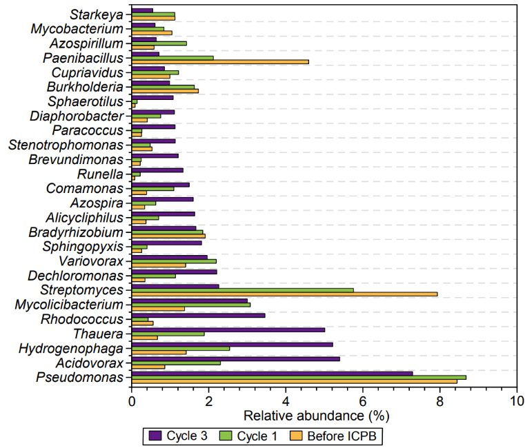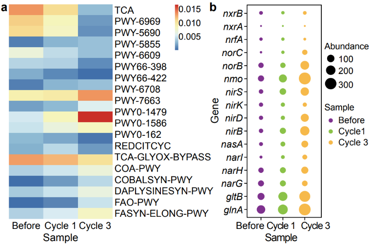 通过对细菌群落的多样性分析发现,在ICPB反应后微生物群落的丰富度和均匀度下降,功能性细菌可能被富集。通过微生物群落分析发现,随着ICPB循环次数的增加,在氮循环中起重要作用的菌属逐渐占据主导地位。此外,系统中的厌氧代谢逐渐取代了好氧代谢。系统的微生物群落朝有利于硝酸盐还原的方向演变。