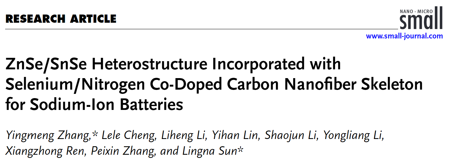 为解决金属硫族化合物作为钠离子电池负极材料时,在转化-合金化过程中伴随着的体积膨胀变形和活性材料粉化导致电极接触减弱,从集电器上剥落等问题,孙灵娜教授团队首先将ZnSn(OH)6纳米盒状前驱体与聚丙烯腈(PAN)进行静电纺丝,得到三维自支撑网络,经过碳化和硒化热处理后,开发出嵌入Se/N共掺杂CNF骨架中的ZnSe/SnSe异质结构(ZnSe/SnSe@Se,N-CNFs)。独特的ZnSe/SnSe异质结构、静电纺丝CNF和Se/N共掺杂特性可有效促进电子/离子传输速率,提高结构稳定性,加速电化学反应动力学:I) ZnSe/SnSe中的异质边界将提供增强的界面耦合效应和内置电场,具有额外的电荷转移驱动力,可吸引更多Na+离子吸附在异质界面上,提高Na+离子从电解液到电极的迁移速率,从而有效加速电化学反应动力学。Ⅱ) 嵌入ZnSe/SnSe纳米盒的三维自支撑CNF网络不仅能增强半导体ZnSe/SnSe的导电性,还能避免在嵌入/脱出过程中发生剧烈的体积膨胀/收缩,改善其结构的完整性。Ⅲ) Se/N共掺杂特性实现了CNF基体与硒化异质结构之间的耦合效应,实现了离子/电子的快速传输,加速了钠离子储存的表面/内部反应动力学,并增强了CNF基体的电子导电性和电解液润湿性。这项研究为解决目前合金基材料在钠离子电池中所面临的挑战提供了一些具有启发性的设计思路:通过异质纳米结构构建、碳壳涂层和共掺杂改性策略,提高了导电性;通过将合金材料嵌入具有三维独立骨架特征的碳基体,解决了体积膨胀问题。该论文《ZnSe/SnSe Heterostructure Incorporated with Selenium/Nitrogen Co-Doped Carbon Nanofiber Skeleton for Sodium-Ion Batteries》发表在《Small》(影响因子13.3,中科院JCR 2 区),竞彩官网-竞彩app-竞彩足球app