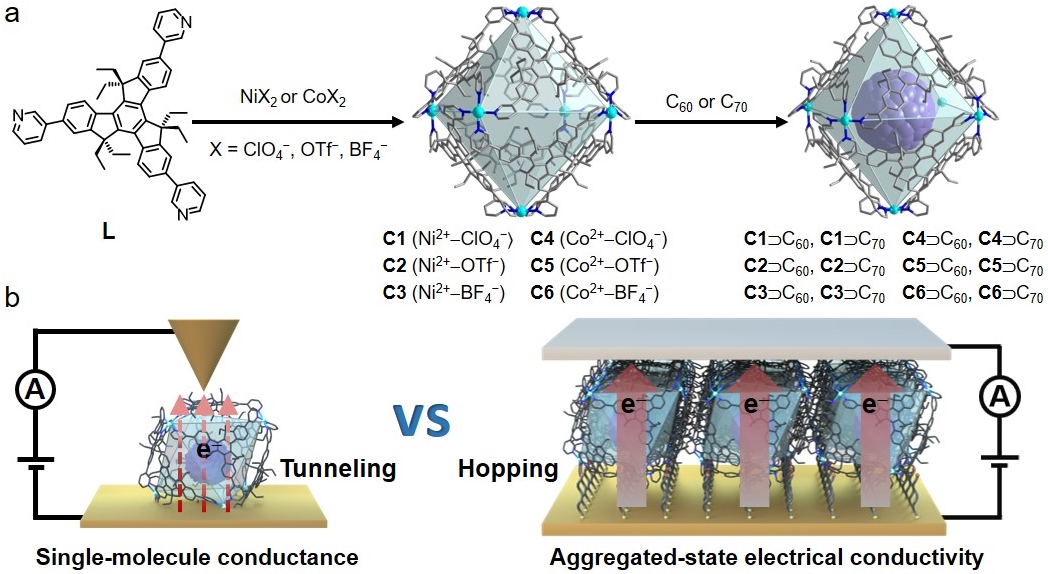 图1. (a)金属配位超分子八面体笼及其主客体复合物的构筑策略;(b)单分子水平和聚集态下的超分子导电性测量。