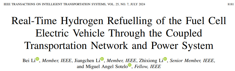 李倍老师在领域顶级期刊《IEEE Transactions on Intelligent Transportation Systems》(影响因子7.9,中科院1区,TOP期刊)上发表了题为《Real-Time Hydrogen Refuelling of the Fuel Cell Electric Vehicle Through the Coupled Transportation Network and Power System》的研究论文。李倍为独立第一作者。深圳大学为第一单位。其他作者包括Jiangchen Li, Nanjing University of Aeronautics and Astronautics, China;Zhixiong Li, Opole University of Technology, Poland;Miguel Angel Sotelo, University of Alcalá, Spain。
