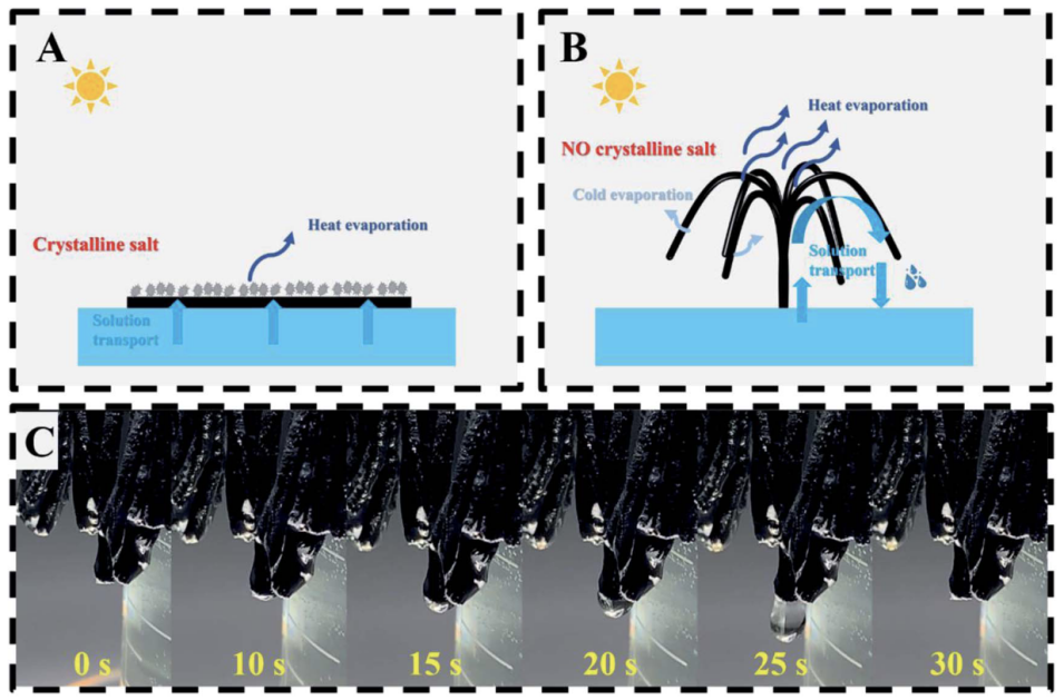 本研究设计了一种新型滑梯型棉基太阳能蒸发器,实现了毛细管力诱导重力辅助的快速水输送。在1个太阳光(1 KW m-2)下,在3.5 wt% NaCl溶液中长期蒸发10 天,获得了稳定的水分蒸发速率(1.77 kg m-2 h−1)和光热转换效率(95.47%)。此外,充足的水供应促进了蒸发表面及其周边无盐聚集的自清洁性能。本研究为实现海水资源的综合利用提供了新的思路。