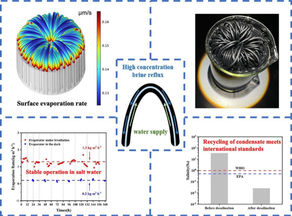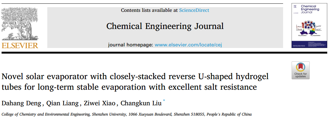 题为《Novel solar evaporator with closely-stacked reverse U-shaped hydrogel tubes for long-term stable evaporation with excellent salt resistance》的研究论文,硕士研究生邓达行为第一作者,刘长坤副教授为通讯作者,深圳大学为第一作者单位和唯一通讯单位。该论文发表于国际著名期刊Chemical Engineering Journal(中科院大类1区,影响因子15.1(接收发表日))。