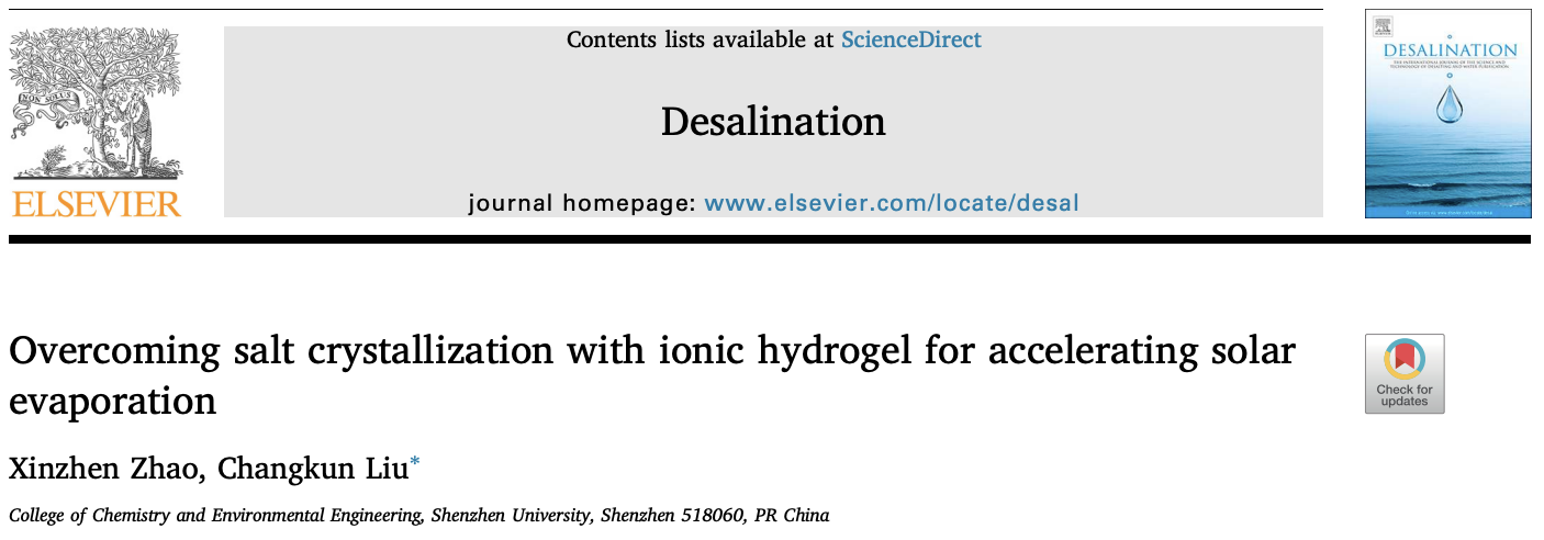 题为《Overcoming salt crystallization with ionic hydrogel for accelerating solar evaporation》的研究性论文,副研究员赵新振为第一作者,刘长坤副教授为通讯作者,深圳大学为第一作者单位和唯一通讯单位。该论文发表于国际著名期刊 Desalination(中科院大类1区,影响因子9.5(接收发表日))上。