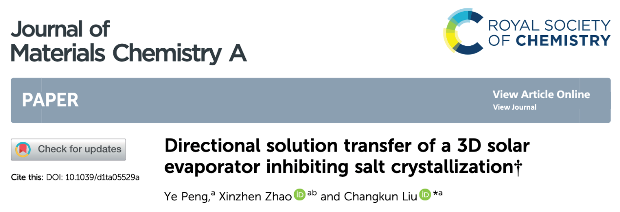 题为《Directional solution transfer of a 3D solar evaporator inhibiting salt crystallization》的研究性论文,硕士研究生彭烨为第一作者,刘长坤副教授为通讯作者,深圳大学为第一作者单位和唯一通讯单位。该论文发表于国际著名期刊 Journal of Materials Chemistry A(中科院大类1区,影响因子14.5(接收发表日))。
