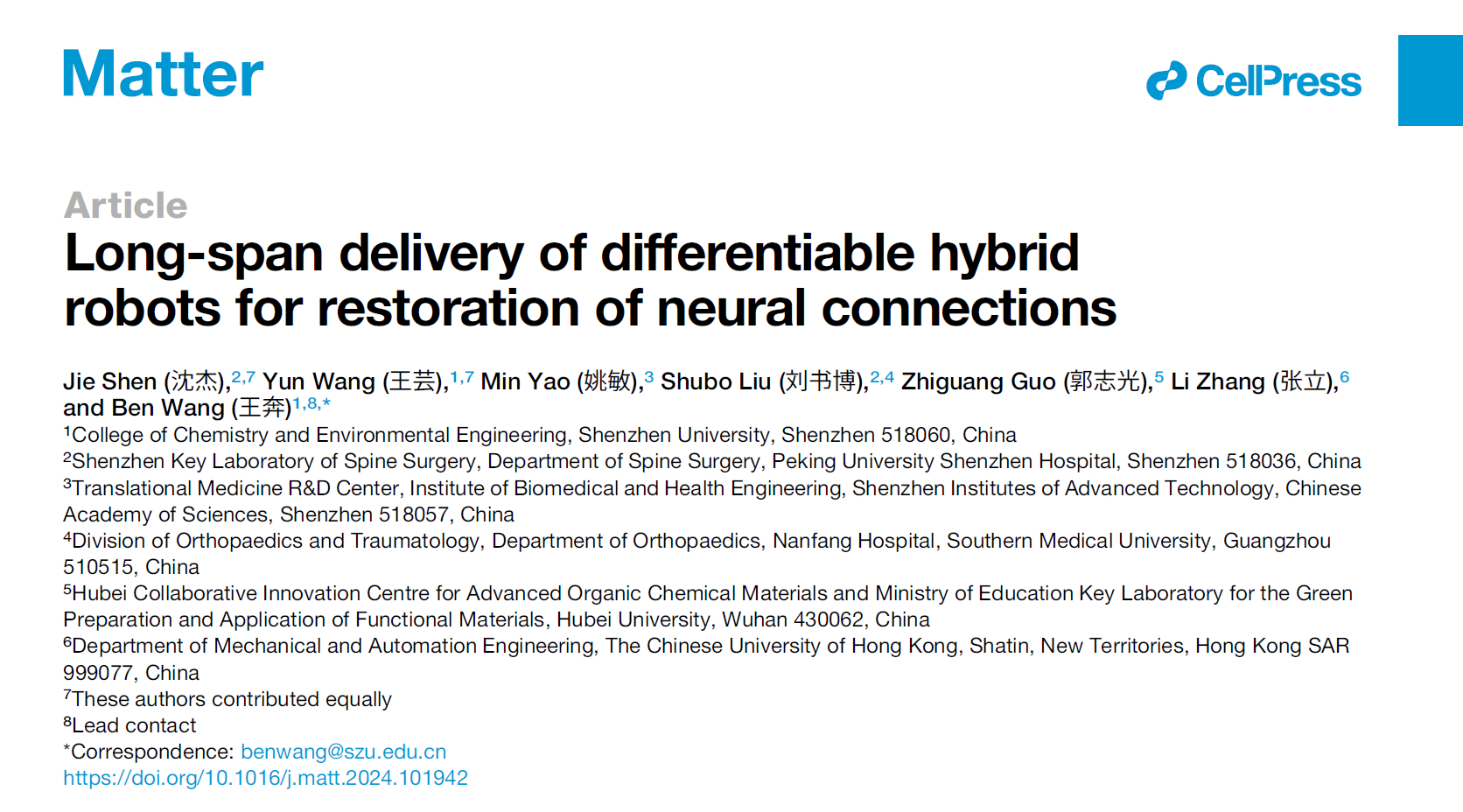 王奔老师在医用软体机器人领域取得重要研究进展,其研究成果以题为“Long-span delivery of differentiable hybrid robots for restoration of neural connections”发表在国际顶级期刊《Matter》上。文章提出了一种基于干细胞自组装的仿生软体微型机器人,实现了在复杂脊液环境中靶向递送干细胞并促进神经连接修复,为神经损伤的微创治疗提供了全新方案。深圳大学为该论文第一完成单位,王奔老师为通讯作者,深圳大学2020级硕士研究生王芸为共同第一作者。