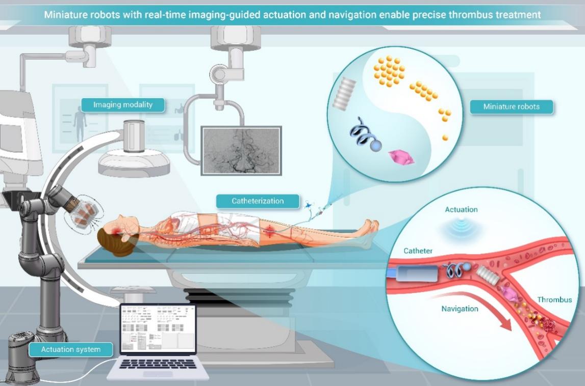 图3. 微型机器人驱动与成像系统引导下的大脑深部血栓治疗示意图。
