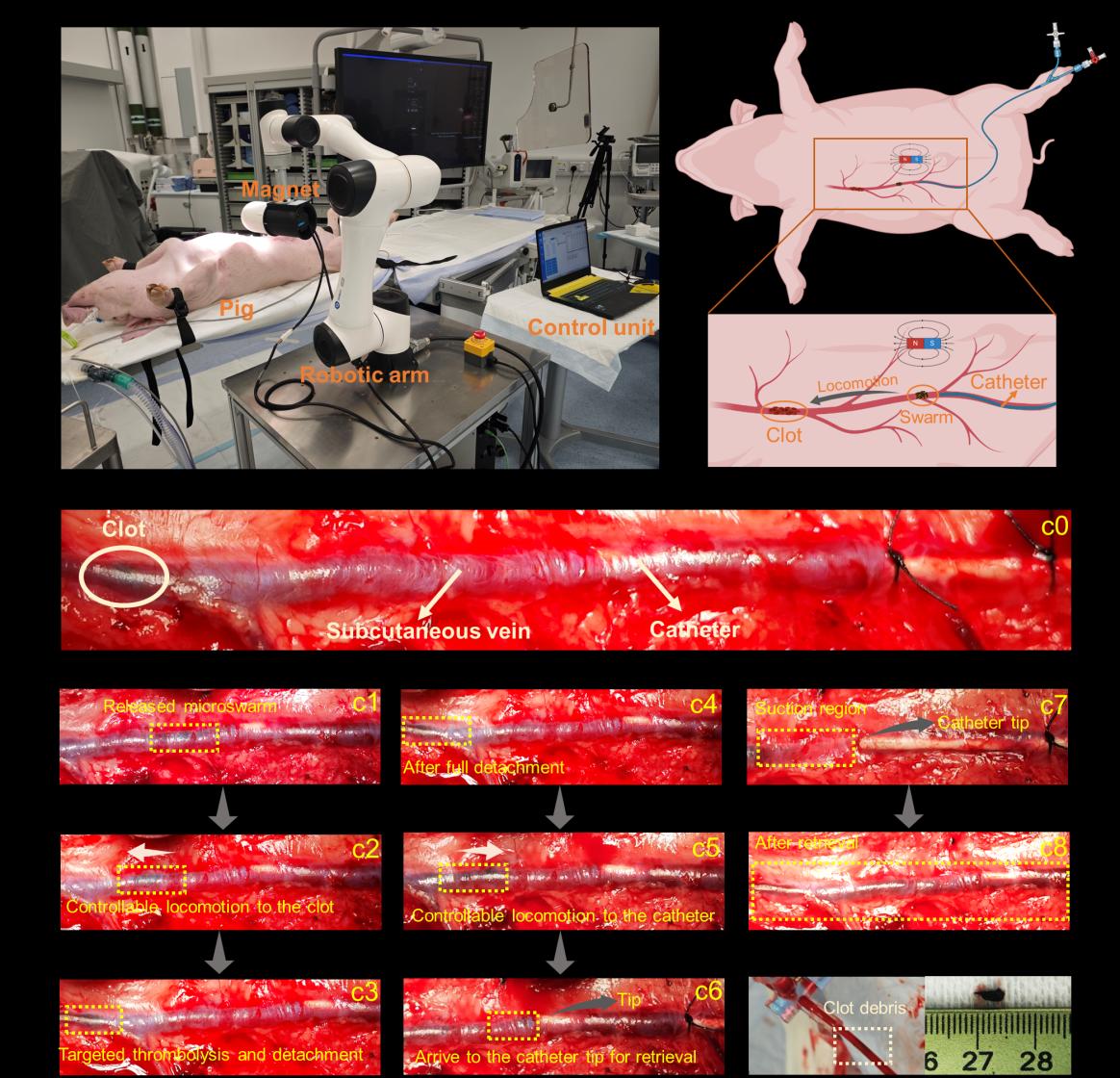 血栓性疾病,如缺血性卒中、肺栓塞和心肌梗死,严重威胁人类健康。现有治疗方法如机械取栓和溶栓等,存在操作复杂、治疗时间长及潜在副作用等问题。为了克服这些挑战,研究团队合成了高酶活性的 tPA-modified 纳米颗粒。在设计的磁场作用下,tPA-microswarm 能沿血管壁精准降解血栓并快速剥离碎片(图1)。碎片被磁化后,通过螺旋游动推进,最终由导管吸力回收。整个过程,包括导管输送、可控运动、血栓剥离和回收,可在约半小时内完成,显著快于传统溶栓治疗时间。研究表明,该策略在模拟血管和活体猪模型中均展现高效性与安全性(图2),为急性血栓性疾病的快速治疗提供新可能。