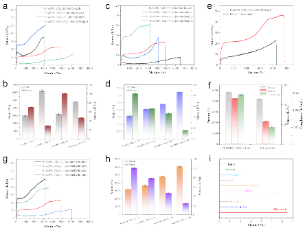 图 5 ICR的制备与表征。(a)ICR制备示意图。(b) FTIR纯HFBA、PEGDA、橡胶和ICR的光谱。(c) TGA ICRC和R-6F的曲线;(d)ICR的小角散射图样。(e)ICR的二维MR图像。(f)ICR及其不同交联剂添加比例下的应力-应变曲线。(g)ICR及其不同交联剂添加比例下的穿刺抗力图。(h)ICR的防穿刺数码照片。