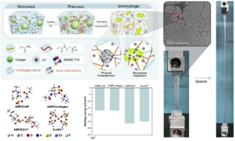 图 3 超拉伸P(AMPS-AM-C)-Zn离子水凝胶的设计原理与制备