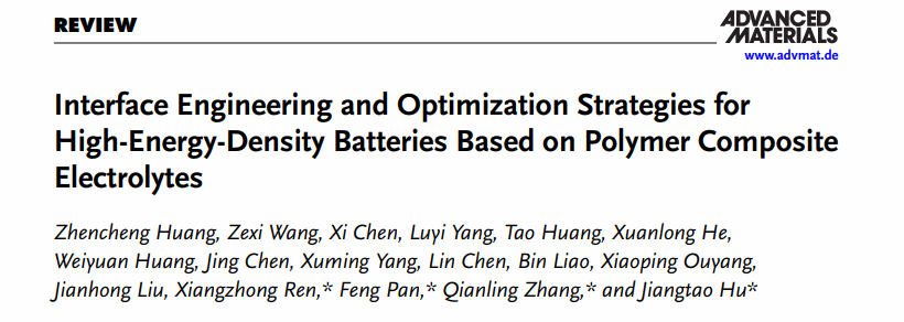 任祥忠教授团队在材料领域顶尖期刊《Advanced Materials》(影响因子26.8,中科院JCR 1区,TOP期刊)发表了题为《Interface Engineering and Optimization Strategies for High-Energy-Density Batteries Based on Polymer Composite Electrolytes》的综述论文。深圳大学黄振城博士和团队成员王泽熙为论文共同第一作者,北京大学潘锋教授,深圳大学任祥忠教授、张黔玲教授和胡江涛副教授为该论文共同通讯作者,深圳大学为第一作者单位和第一通讯单位。