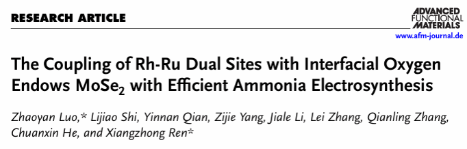 任祥忠教授团队在材料领域顶尖期刊《Advanced Functional Materials》(影响因子19,中科院JCR 1区,TOP期刊)发表了题为《The Coupling of Rh-Ru Dual Sites with Interfacial Oxygen Endows MoSe2 with Efficient Ammonia Electrosynthesis》的研究论文。深圳大学罗兆艳助理教授为论文第一作者,深圳大学任祥忠教授和深圳大学罗兆艳助理教授为该论文共同通讯作者,深圳大学为唯一通讯单位。