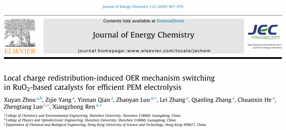 任祥忠教授团队在材料领域顶尖期刊《Journal of Energy Chemistry》(影响因子14.9,中科院JCR 1区,TOP期刊)发表了题为《Local charge redistribution-induced OER mechanism switching in RuO2-based catalysts for efficient PEM electrolysis》的研究论文。深圳大学周戌燕博士后为论文第一作者,深圳大学任祥忠教授、罗兆艳助理教授和香港科技大学罗正汤教授为该论文共同通讯作者,深圳大学为第一作者单位和第一通讯单位。