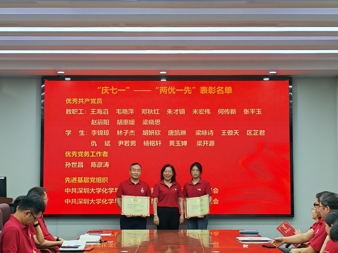 党委副书记徐晓玲老师为荣获“优秀党务工作者”的两位老师颁奖。