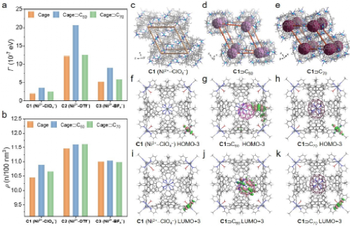 图4. (a,b)金属配位超分子聚集状态下的电极-分子耦合(Γ,通过用单能级模型拟合实验J-V数据估算)和堆积密度(ρ)。(c-e)C1C1⊃C60C1⊃C70的简化堆积模式,用于估算图4b中所示的堆积密度(为表达清晰,氢原子、溶剂和无序抗衡阴离子均已省略)。这种堆积模式是通过连接八个相邻八面体组装体的中心点提取的。(f-h)C1C1⊃C60C1⊃C70的HOMO-3。(i-k) C1C1⊃C60C1⊃C70的LUMO+3。