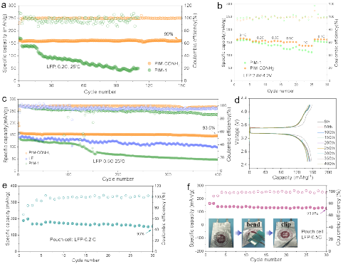 2. 固态锂金属电池性能表现. (a) LFP|PIM-1|Li与LFP|PIM-CONH2|Li在0.2C倍率、25℃条件下的循环性 (b) LFP|PIM-1|Li与LFP|PIM-CONH2|Li的倍率性能 (c) LFP|PIM-1|Li、LFP|PIM-CONH2|Li及LFP|LE|Li在0.5C倍率、25℃条件下的循环性能 (d)LFP|PIM-CONH2|Li在0.5C倍率、25℃条件下的充放电曲线(e)LFP|PIM-CONH2|Li软包电池在0.2C倍率、25℃条件下的循环性能(f) LFP|PIM-CONH2|Li软包电池经折叠与裁切后,在0.5C倍率、25℃条件下的循环性能