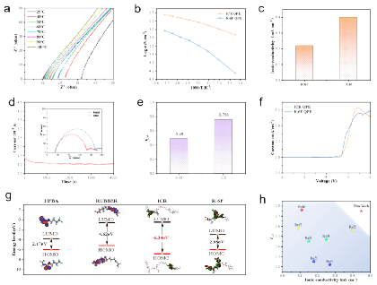 6 ICR QPE的Li+传输特性和电化学特性。不同温度下ICR QPE的(a)阻抗图。(b)ICR QPE和R-6F QPE离子电导率的阿伦尼乌斯图。(c)ICR QPE与R-6F QPE在室温下离子电导率比较的柱状图。(d)Li|ICR QPE |Li电池的极化曲线及初始和稳态阻抗图。(e)ICR QPE与R-6F QPE锂离子迁移数比较的柱状图。(f)ICR QPE和R-6F QPE的LSV曲线。(g)HFBA、纯橡胶、ICR QPE、R-6F的HOMO和LUMO能级。(h) ICR QPE与其他材料的离子电导率和电导率比较。